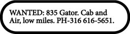 WANTED: 835 Gator. Cab and Air, low miles. PH-316 616-5651.
