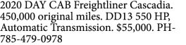2020 DAY CAB Freightliner Cascadia. 450,000 original miles. DD13 550…