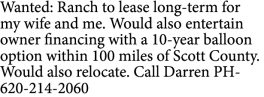 Wanted: Ranch to lease long-term for my wife and me.…