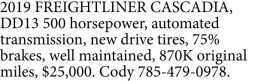 2019 FREIGHTLINER CASCADIA, DD13 500 horsepower, automated transmission, new drive…