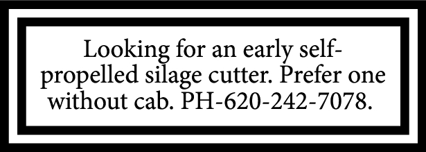 Looking for an early self-propelled silage cutter. Prefer one without cab. PH-620-242-7078.
