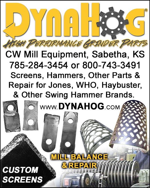 Dynahog Performance Grinder Parts CW Mill Equipment, Sabetha, KS 785-284-3454 or 800-743-3491 Screens, hammers, other parts & repair for Jones, WHO, Haybuster, & other swing hammer brands. www.dynahog.com custom screens, mill balance & repair