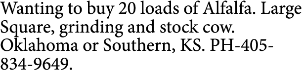Wanting to buy 20 loads of Alfalfa. Large Square, grinding and stock cow. Oklahoma or Southern, KS. PH-405-834-9649.