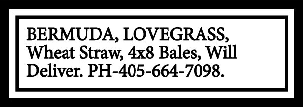 BERMUDA, LOVEGRASS, Wheat Straw, 4×8 Bales, Will Deliver. PH-405-664-7098.