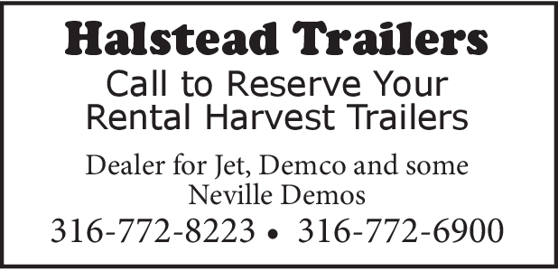 Halstead Trailers – Call to Reserve Your Rental Harvest Trailers – Dealer for Jet, Demco and some Neville Demos – 316-772-8223 – 316-772-6900