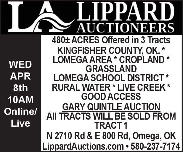 Lippard Real Estate & Auction Specializing in Farm Equipment and Ranch Land Check out our web site for upcoming Auctions 580-237-7174 LippardAuctions.com