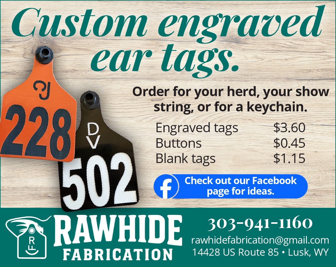 Custom Engraved Ear Tags. Rawhide Fabrication.
