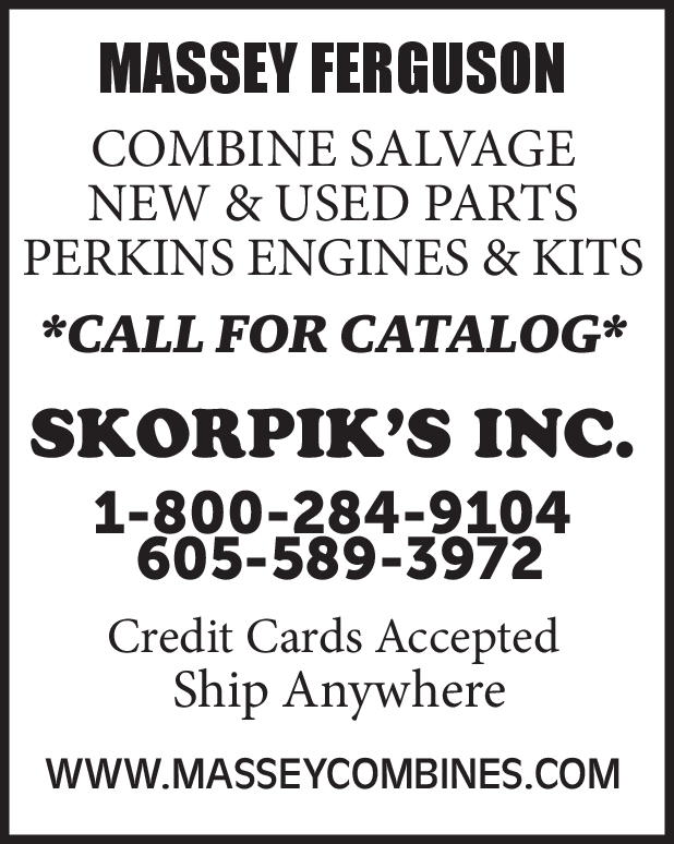 MASSEY FERGUSON – COMBINE SALVAGE – NEW & USED PARTS – PERKINS ENGINES & KITS – “Genuine MF 760, narrow concave #273632 M92 List $1,675 – Sale $1,250” CALL FOR CATALOG – SKORPIK’S INC. 1-800-284-9104 – 605-589-3972 – Credit Cards Accepted – Ship Anywhere – www.masseycombines.com