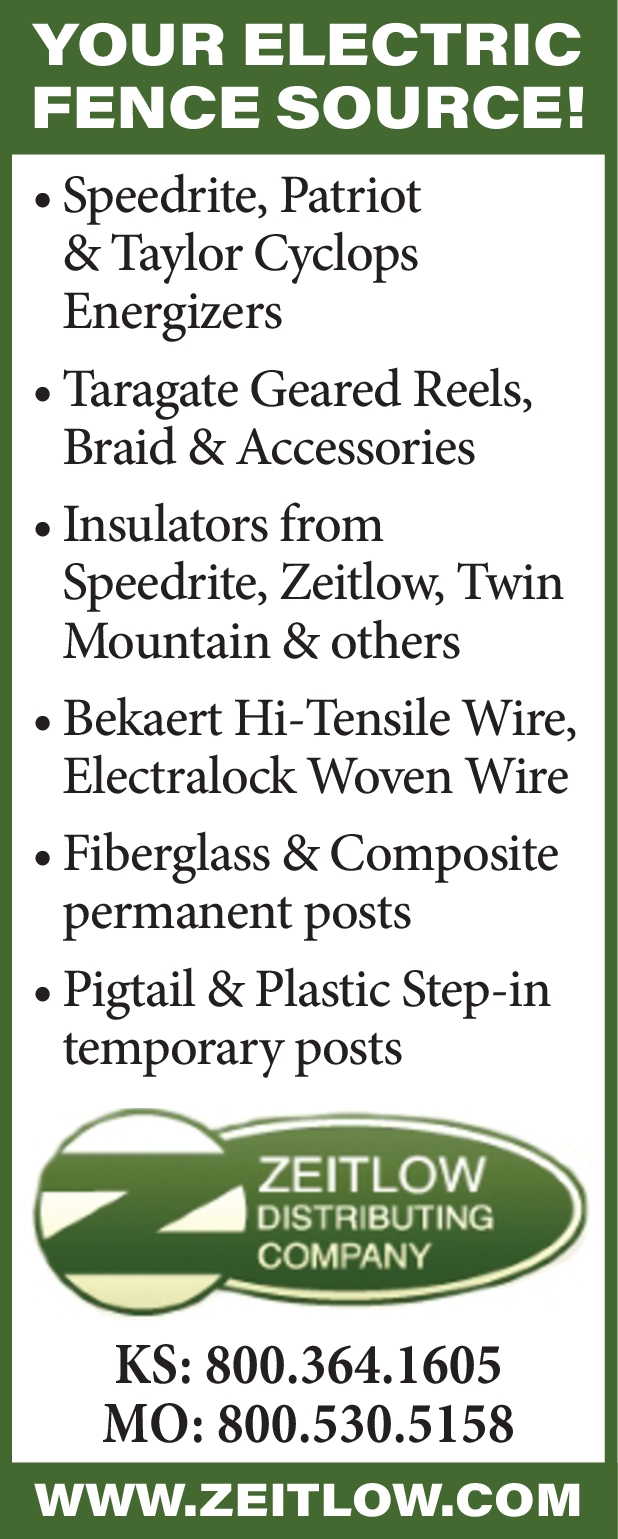 Zeitlow Distributing Company YOUR ELECTRIC FENCE SOURCE! WWW.ZEITLOW.COM – Speedrite, Patriot & Taylor Cyclops Energizers – Taragate Geared Reels, Braid & Accessories – Insulators from Speedrite, Zeitlow, Twin Mountain & others – Bekaert Hi-Tensile Wire, Electralock Woven Wire – Fiberglass & Composite permanent posts – Pigtail & Plastic Step-in temporary posts