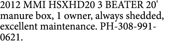 2012 MMI HSXHD20 3 BEATER 20′ manure box, 1 owner, always shedded, excellent maintenance. PH-308-991-0621. 15 Words