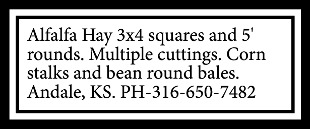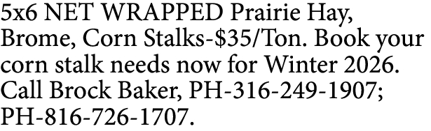 5×6 NET WRAPPED Prairie Hay, Brome, Corn Stalks-$35/Ton. Book your corn stalk needs now for Winter 2026. Call Brock Baker, PH-316-249-1907; PH-816-726-1707.