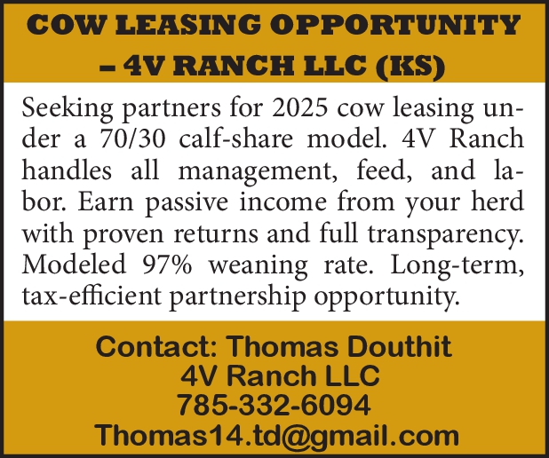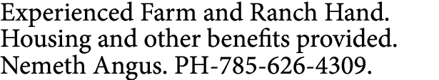 Experienced Farm and Ranch Hand. Housing and other benefits provided. Nemeth Angus. PH-785-626-4309.