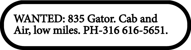 WANTED: 835 Gator. Cab and Air, low miles. PH-316 616-5651.
