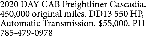 2020 DAY CAB Freightliner Cascadia. 450,000 original miles. DD13 550 HP, Automatic Transmission. $55,000. PH-785-479-0978