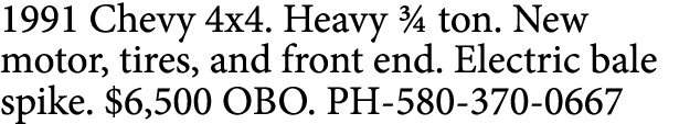 1991 Chevy 4×4. Heavy ¾ ton. New motor, tires, and front end. Electric bale spike. $6,500 OBO. PH-580-370-0667