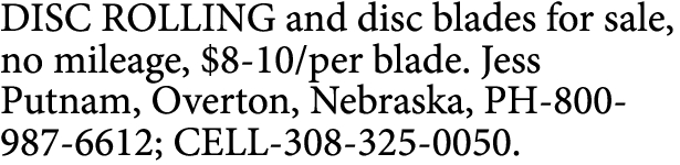 DISC ROLLING and disc blades for sale, no mileage, $8-10/per blade. Jess Putnam, Overton, Nebraska, PH-800-987-6612; CELL-308-325-0050.