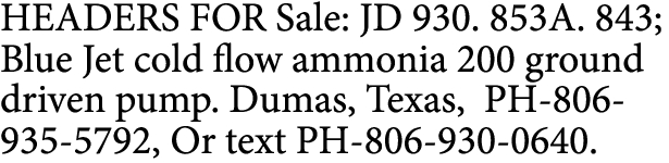 HEADERS FOR Sale: JD 930. 853A. 843; Blue Jet cold flow ammonia 200 ground driven pump. Dumas, Texas, PH-806-935-5792, Or text PH-806-930-0640.
