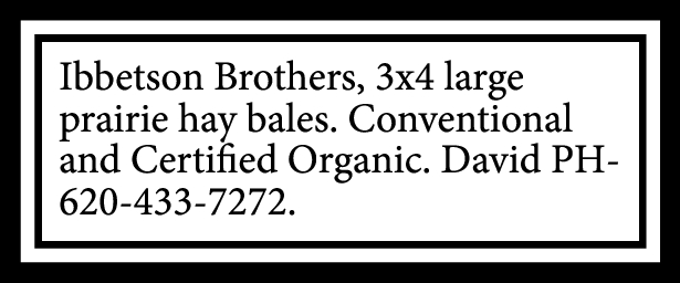 Ibbetson Brothers, 3×4 large prairie hay bales. Conventional and Certified Organic. David PH-620-433-7272.