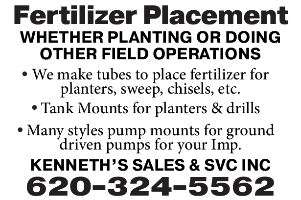 Kenneth’s Sales & Service Fertilizer Placement 620-324-5562 WHETHER PLANTING OR DOING OTHER FIELD OPERATIONS KENNETH’S SALES & SVC INC We make tubes to place fertilizer for planters, sweep, chisels, etc. Many styles pump mounts for ground driven pumps for your Imp. Tank Mounts for planters & drills