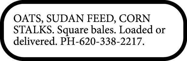 OATS, SUDAN FEED, CORN STALKS. Square bales. Loaded or delivered. PH-620-338-2217.