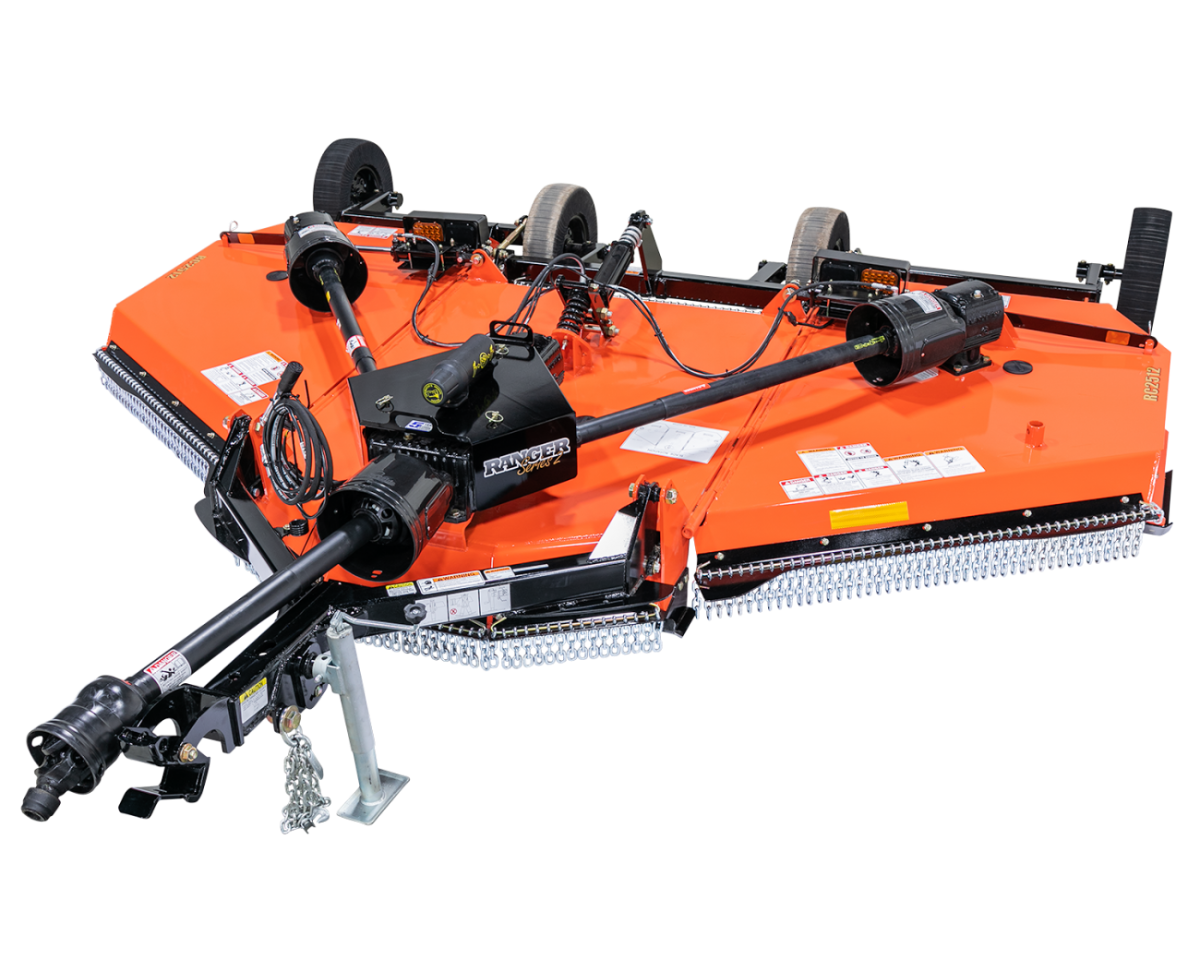 Width: 12′, PTO Size: 540, 12′, 3 Section Flex Mower, 21″ Solid Tires, Swivel Clevis Hitch, Cat 4 Drivelines, Front and Rear Chain Guards