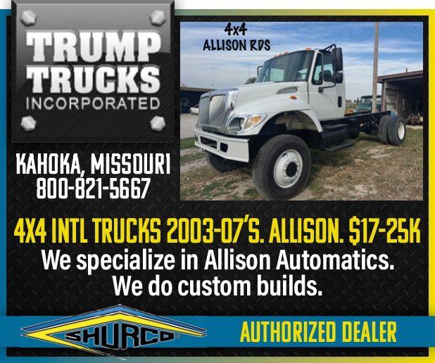 Trump Trucks Inc. Kohoka, Missouri 800-821-5667 4×4 INTL TRUCKS 2003-07’s. ALLISON. $17k-25k. We specialize in Allison Automatics. We do custom Builds. Shurco Authorized Dealer.